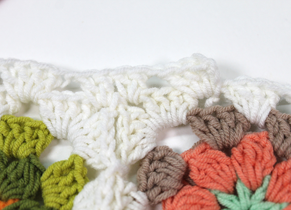 1. 테두리 뜨기 : 고랑마다 한길긴뜨기 4개 + 사슬 1개 반복해 주고, 모티브가 서로 맞닿은 부분은 한길긴뜨기 두 개씩 떠줍니다. (아래 사진 참조 ) 다시 사슬 1개 하고 다음 고랑에 한길긴뜨기 4개 반복해 주면 됩니다.