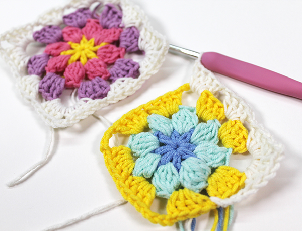 원하는 칼라 배색으로 코바늘 모티브를 만들고, 이어 붙일 수 있으면 블랭킷, 가방, 가전제품 덮개, 인테리어 소품 등 다양하게 원하는 작품을 만들 수 있습니다.  모티브를 잇는 방법은 여러 가지가 있지만, 돗바늘을 사용하지 않고 마지막 단을 떠가면서 보다 손쉽게 모티브를 잇는 방법을 소개합니다.