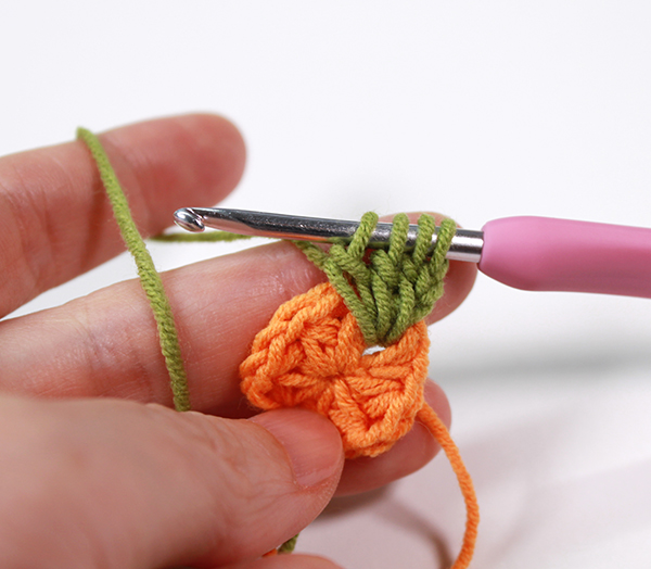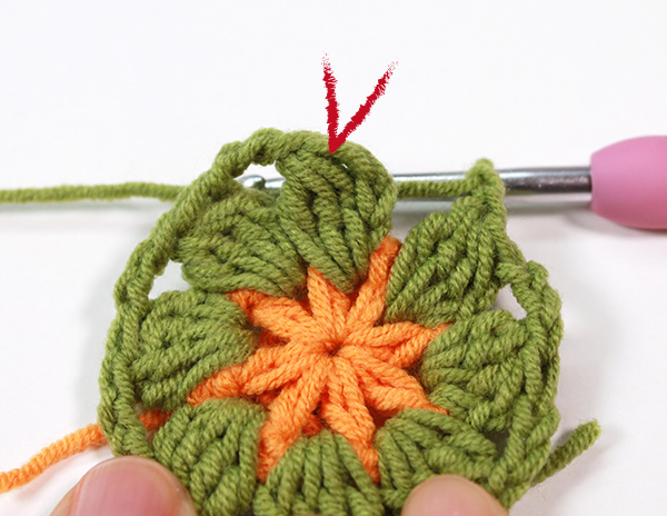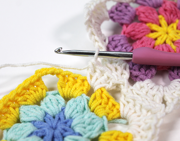 2. 모서리 사슬 3개 중 두 번째 사슬을 뜰 때에 다른 모티브를 가져와 고랑에 사슬을 뜨면서 붙여줍니다.