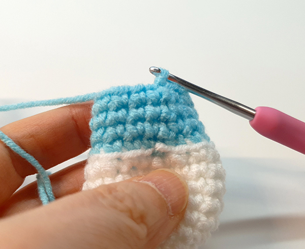 2. 다음 코부터 쭉 한 코에 한 개씩 짧은뜨기 해준 뒤 첫 번째 짧은뜨기코에 빼뜨기 해줍니다.