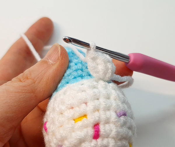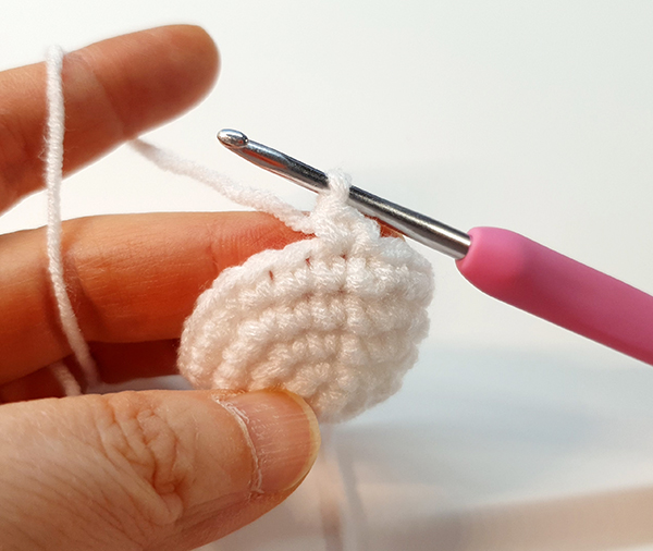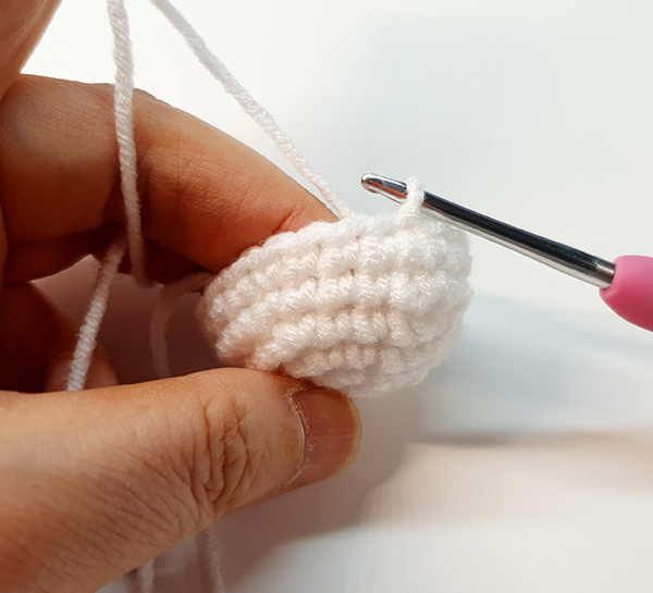 3. 다음 코부터 매 코마다 한코에 짧은뜨기 두 개씩 넣어주어 총 10코를 만들어준 뒤, 첫 번째 짧은뜨기 코에 빼뜨기 해줍니다.