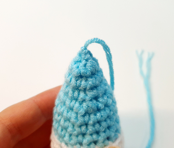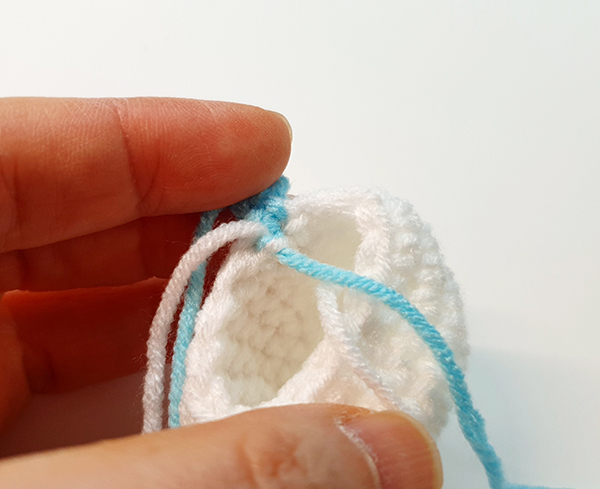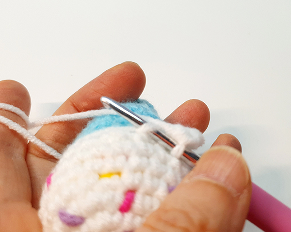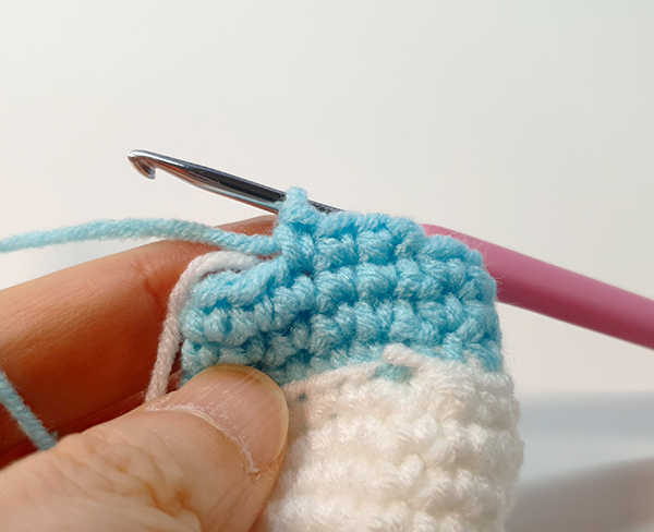 3. 첫 번째 짧은뜨기 코에 빼뜨기 한 뒤 실을 잘라줍니다.