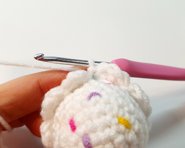 1. 아이스크림 본체 9단에서 이랑뜨기를 뜨면서 만들어진 코에 뜹니다.