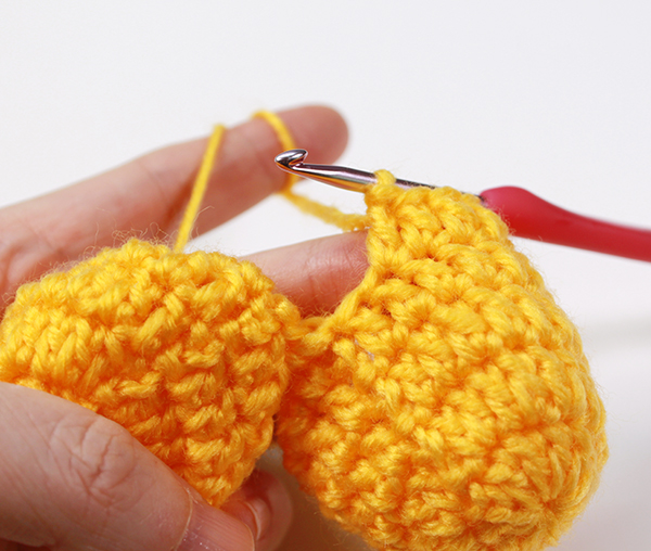 3. 처음 5단을 뜬 마지막코와 이어붙이는 다른 하나의 첫 코를 같이 잡아 한길긴뜨기를 뜬 뒤 이어 붙이는 다른 하나의 두 번째 코를 이어서 한코에 하나씩 한길긴뜨기 떠 줍니다.