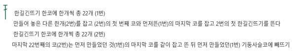 4. 한코에 한길긴뜨기를 쭉 떠서 총 22코를 만들어 주는데, 마지막 22번째 코는 처음만들었던 편물의 마지막 코와 같이 떠줍니다.